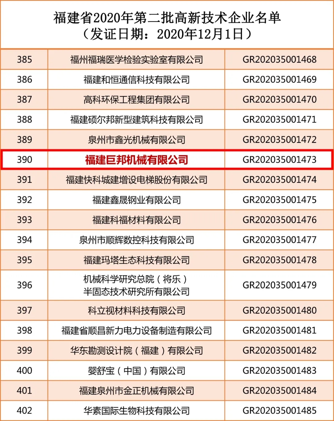 | 巨邦機械上榜福建省2020年第二批高新技術企業(yè)名單 |