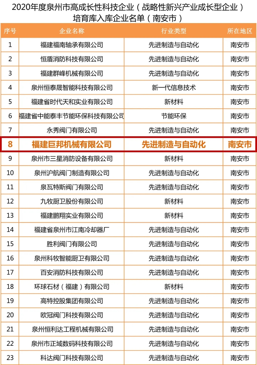 福建巨邦機(jī)械有限公司入列其中。目前,全市共有泉州市高成長性科技企業(yè)36家。